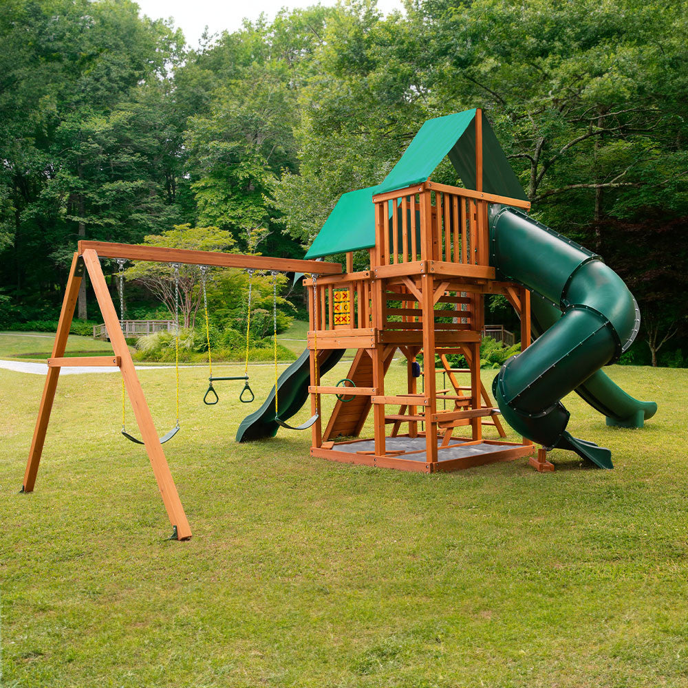 The excitement never ends with this Backyard Products' Savannah Swing Set. Children will love zipping down the Extreme Tube II and Alpine Wave slides, as well as scaling back up via the rope ladder and rock-climbing wall. A tower connected to a clatter bridge promotes imaginative play, while the belt swings and trapeze swing offer aerial fun. The swing set's cedar construction features solid 4” x 4” support beams and a 4” x 6” swing beam finished in a beautiful amber stain.