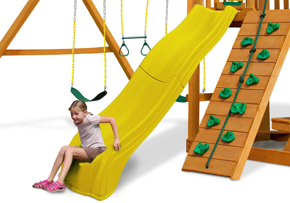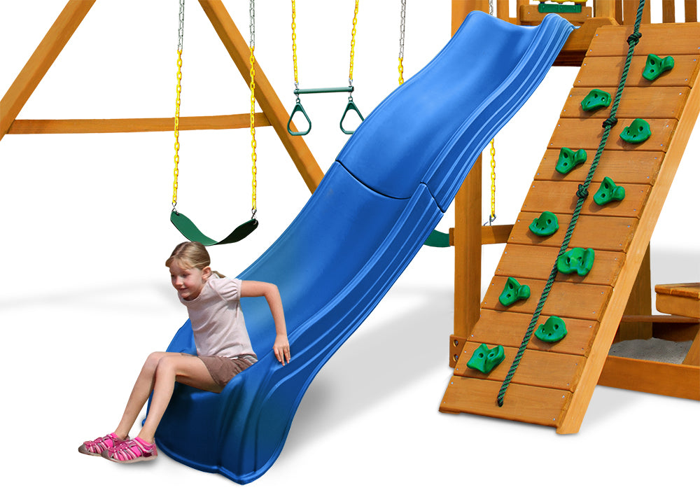 Upgrade your outdoor play set or swing set instantly with the Olympus Wave Slide by PlayNation. This unique two-piece slide is designed for speed and comfort with a smooth scoop and wave. The 2-piece, resilient plastic construction easily supports up to 250 pounds for years of enjoyment. Easily mounts to most 4' 6" - 5' platforms. This slide is proudly made in the USA and features a lifetime warranty against distress.