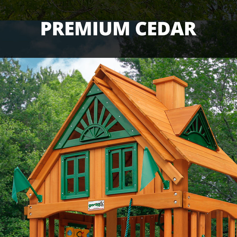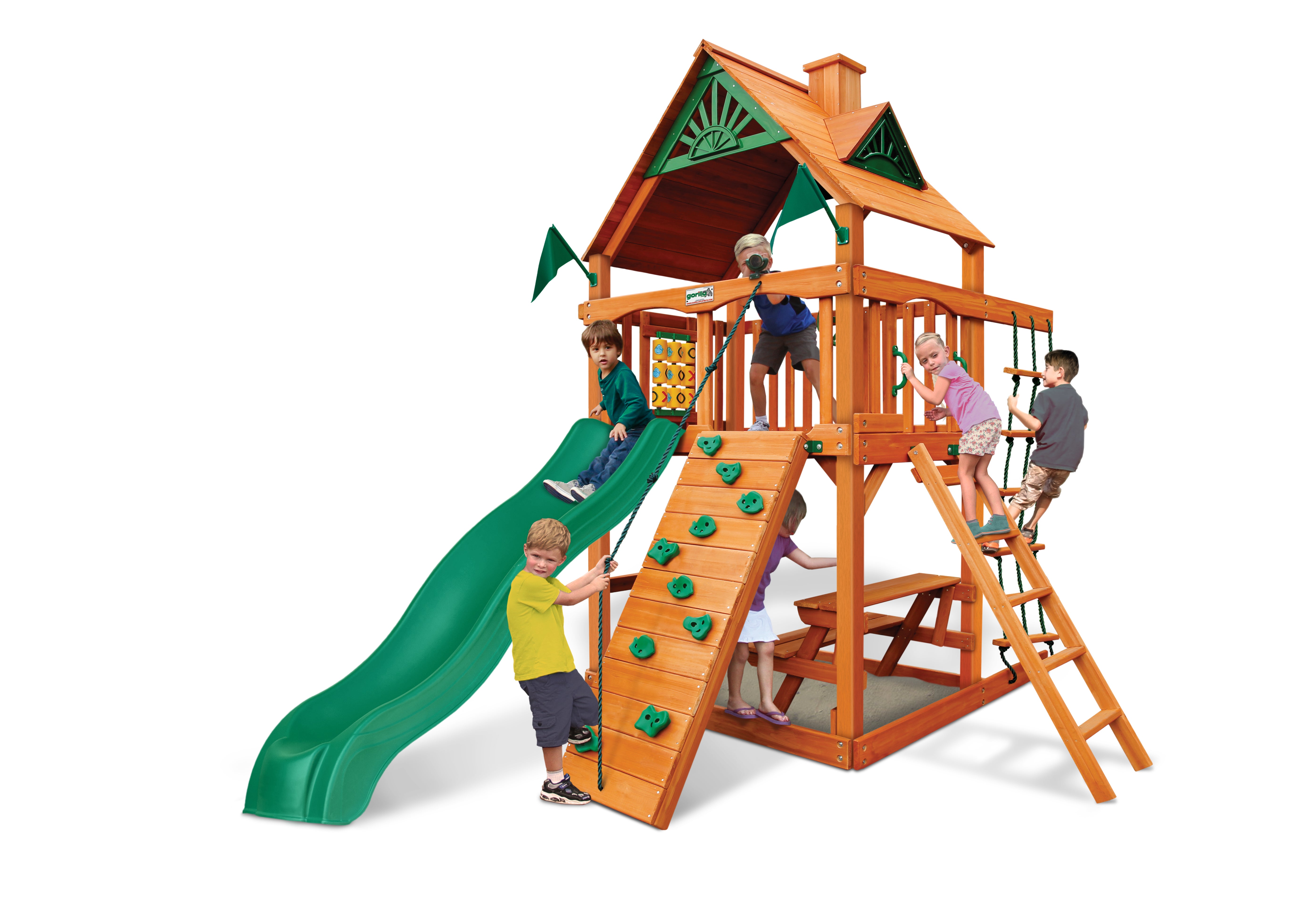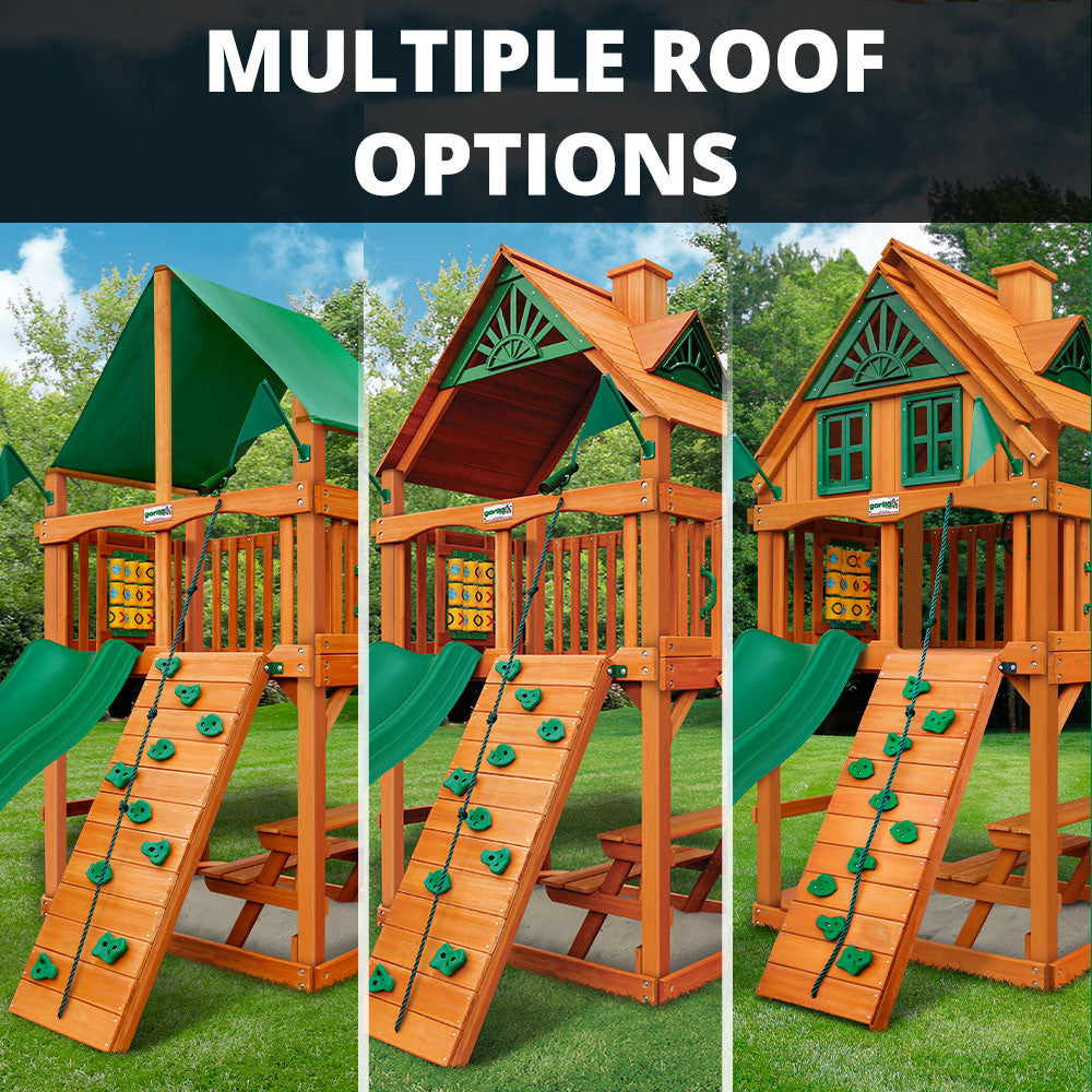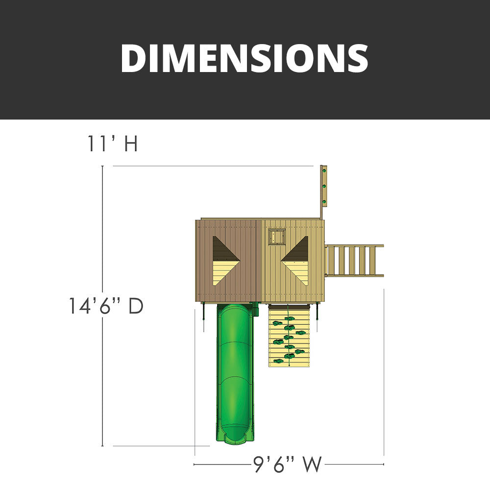 Want a place for your kids to play, but don't have room for the swings? You're in luck with our Chateau Tower™! Select from our wood roof (available with or without our Treehouse Add-On or Fort Add-On) or our green vinyl canopy.